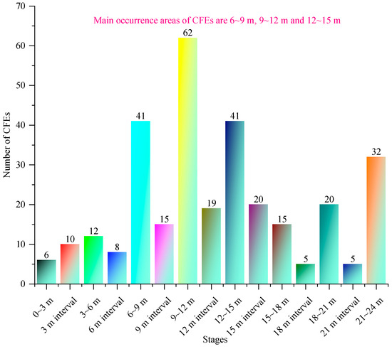 This study aimed to investigate whether the innovative methods were applicable in the presence of a large number of CFEs. And another important purpose was to study the generation characteristics of CFEs, including the mechanisms of occurrence, distribution patterns, release features, fractal results, etc. So, combined with the depth results, the numbers of CFEs of different depths during the whole UPRD borehole construction process (drilling and interval) were counted in Figure 7. After statistics, 311 CFEs were generated during the UPRD borehole construction, of which 229 were generated in the drilling process, accounting for 74% of the total CFEs, and 82 were generated in the interval process, accounting for 26% of the total CFEs. The occurrence of so many CFEs was rare, and few on-site and research results have suggested that such a large number of CFEs would appear. Therefore, the experimental data in this study was more valuable for providing feedback on certain phenomena and patterns, laying a good foundation for further mechanism and technical research. The number of CFEs was different in different depths, and the most quantity of CFEs was produced in 6–9 m, 9–12 m, and 12–15 m, which were 41, 62, and 41, respectively (the total of the three depths was 144, accounting for 48% of the total CFEs during the drilling process). The drilling process of 21–24 m produced 32 CFEs, which was the maximum value of the remaining depth (excluding 6–9 m, 9–12 m, and 12–15 m). The above facts could preliminarily determine that the higher the drilling pressure, the more CFEs would be produced, and the two may be positively correlated.