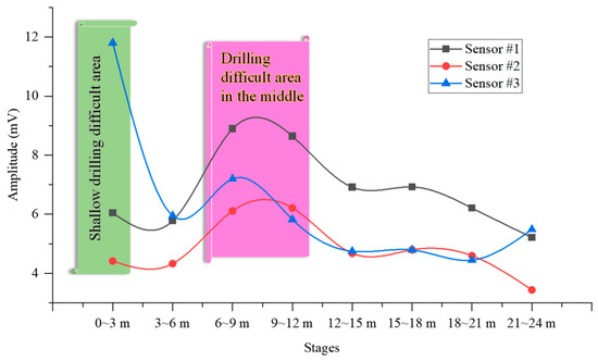Amplitude curve of three sensors with time during UPRD drilling (did not include CFEs).