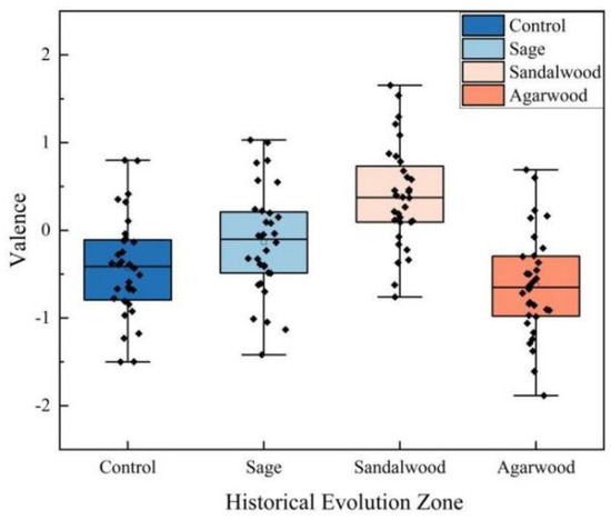 In the HEZ, scents should help visitors enter a state of reflection, nostalgia, and memory, infused with a sense of historical weight and cultural atmosphere. Compared to aromatic plants, woody and herbal scents are more suitable for this historical context, providing a more profound sense of history and a tranquil atmosphere. Our findings revealed significant differences in valence produced by different scents (F(3, 124) = 17.607, p < 0.001, η2 = 0.299). Overall, in the HEZ, visitors’ valence tended toward heaviness, accompanied by a touch of melancholy, resulting in lower valence scores (Figure 5). Relative to the scentless landscape, sandalwood, and sage significantly enhanced positive valence by 70% and 190%, respectively, while agarwood decreased it by 47%. Among these, the combination of sandalwood and the HEZ leads to a more positive emotional state for visitors. The warm aroma of sandalwood tends to evoke feelings of pleasure, tranquility, and comfort, making visitors feel calm and content. Conversely, agarwood can evoke nostalgia, reverence, and a sense of gravity, helping visitors appreciate the weight of history and the profound impacts of historical processes. This results in a heavier emotional experience in the HEZ, yielding a lower valence compared to the scentless condition, yet it still effectively reflects the spirit conveyed by this area.