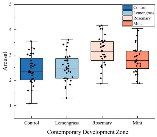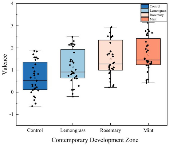 In the CDZ, there were significant differences in the valence produced by different scents (F(3, 124) = 11.896, p < 0.001, η2 = 0.223). As shown in the figure, aromatic plants enhance the valence for visitors in this area. Specifically, mint and rosemary had a notable enhancement effect, increasing valence by 167% and 134%, respectively, while lemongrass only showed a 79% increase (Figure 6). This is because the CDZ typically emphasizes modernization, progress, innovation, and vigor, and aromatic plants can promote positive emotions, enhance focus, and stimulate energy. Mint is closely associated with freshness, vigor, and invigoration. Visitors in a mint-scented environment often feel pleasant and refreshed, which helps elevate positive emotions.