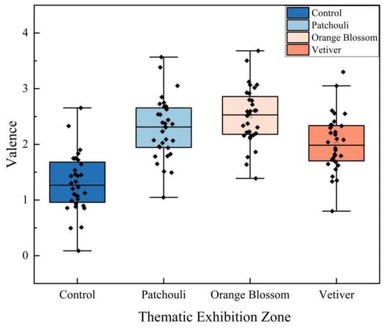 Table 2 presents the valence, arousal, pleasantness of scent, and TMD scores of visitors under no odor conditions across different exhibition areas. From the data, the TEZ had the highest valence score (1.30) and pleasantness of odor score (4.78), indicating that visitors experience a more positive and enjoyable time in this area. In contrast, the HEZ had a negative valence (−0.42), the lowest pleasantness of odor score (4.41), and the highest TMD score (121.59), suggesting that visitors feel relatively more negative emotions in this region. These differences may stem from the relationship between the attractiveness of the content displayed in different areas and visitors’ subjective experiences. The content in the TEZ may be more engaging and interactive, significantly enhancing visitors’ sense of enjoyment while reducing negative emotions. Conversely, the content in the HEZ might be more serious or information-heavy, leading visitors to experience more negative emotions and fatigue, ultimately impacting their overall experience.