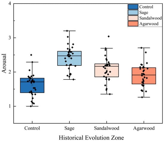 In the HEZ, the arousal effects of different scents exhibited significant differences during historical changes (F(3, 124) = 29.853, p < 0.001, η2 = 0.419). As illustrated in Figure 8, sage had the highest arousal effect, increasing arousal by 49% compared to the no-scent condition, indicating that it can evoke positive emotions. In contrast, sandalwood and agarwood showed lower arousal effects, with increases of only 29% and 17%, respectively. The low-arousal scents of agarwood and sandalwood can create a calm and nostalgic atmosphere, making them more suitable for the HEZ. This environment helps visitors focus their attention and immerse themselves in the profound sense of history, suggesting that the highly arousing scent of sage may not be appropriate for this area.