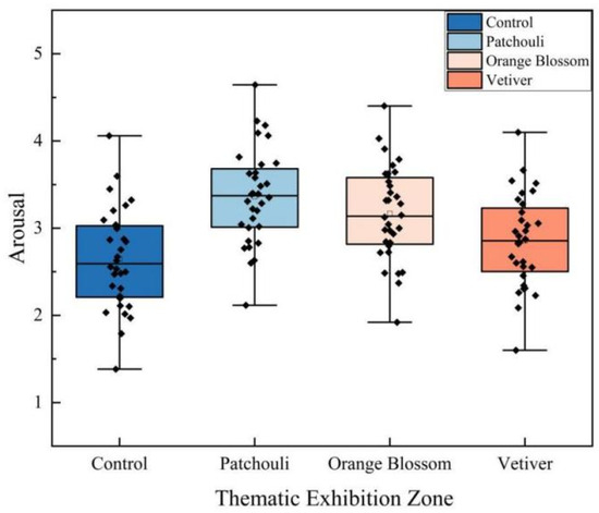 In the TEZ, different scents exhibited significant differences in their arousal effects (F(3, 124) = 10.856, p < 0.001, η2 = 0.208). As shown in Figure 10, various scents positively enhanced arousal, with trends similar to those observed in the CDZ, although the enhancement effects were not as pronounced as in the HEZ. Among the scents, patchouli demonstrated the best arousal effect, enhancing arousal by 27%, while orange blossom increased arousal by 20%. In contrast, vetiver exhibited a limited effect, only enhancing arousal by 8%. This indicates that the arousal effect of vetiver is relatively low; it tends to help visitors calm down, alleviate anxiety, and provide a sense of tranquility and safety. Thus, it is more suitable for exhibition areas that require reflection and serenity.
