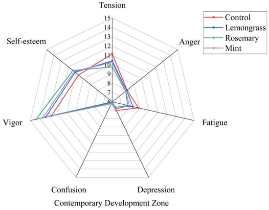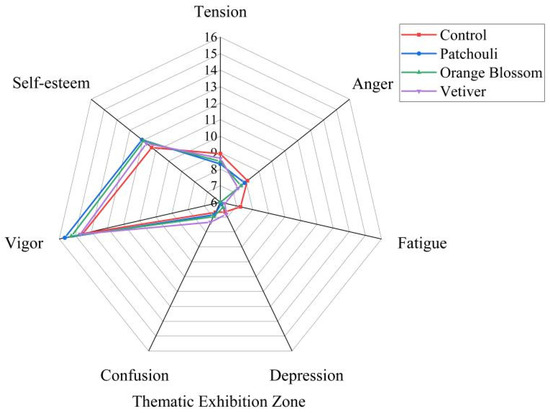 In the CDZ, the TMD exhibited significant differences across various smellscapes (F(3, 124) = 3.672, p < 0.05, η2 = 0.082). As illustrated in Figure 12, rosemary demonstrated the best performance in alleviating tension, fatigue, and depression, while enhancing vigor and self-esteem, although it may have slightly increased visitors’ feelings of confusion. Mint effectively reduced tension and fatigue while improving vigor and self-esteem, but it also had a mild elevating effect on confusion. Lemongrass showed good results in reducing depression and fatigue, with a relatively smaller effect on alleviating tension and the least impact on confusion. This suggests that lemongrass may be the most balanced option for emotional regulation, while rosemary and mint are more suitable for scenarios aimed at enhancing vigor and self-esteem.