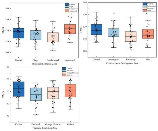 The application value of arousal in smellscapes is reflected in its multiple impacts on spatial atmosphere, emotional regulation, and information processing. By introducing scents with varying arousal levels, the immersive quality of a space can be enhanced, and the physiological and psychological states of visitors can be adjusted. This approach stimulates visitors’ creativity and vigor. Furthermore, arousal levels are closely related to memory formation and information processing; moderate arousal can enhance visitors’ memory of the exhibit content, thus improving the educational and communicative effects of the exhibition. Therefore, by modulating the arousal effects of scents, it is possible to effectively guide visitors’ emotional responses and memory experiences, achieving a profound resonance between space and emotion. An analysis of the smellscapes in the HEZ, CDZ, and TEZ demonstrated that scent combinations can significantly influence human emotions.