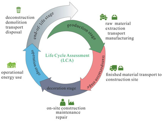 LCA is a scientific methodology that is applied to quantify the environmental impacts throughout the entire lifespan of products, processes, or activities [32,33]. The CEF method, endorsed by the United Nations Intergovernmental Panel on Climate Change (IPCC), calculates carbon emissions by analyzing energy use per unit, and is extensively used to evaluate the sustainability of buildings [34]. To obtain CO2 emission data for building materials, the process-based LCA method is employed to assess and quantify emissions from each material during the manufacturing process, thereby creating a comprehensive database [35]. LCA serves as a robust approach for the comprehensive evaluation of buildings’ long-term carbon emissions [33]. Earlier studies have indicated that the operational stage of buildings decoration is the leading source of CO2 emissions, primarily due to the substantial emissions associated with energy production for equipment operation. Additionally, it is crucial to recognize that the operational phase spans the longest duration within the building’s entire life cycle, emphasizing its critical role in efforts to reduce CO2 emissions [26,36,37].
