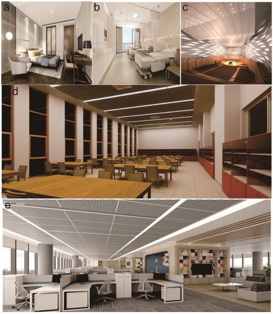 (a) Rendering of the residential building decoration; (b) rendering of hospital decoration; (c) rendering of the sports and cultural building; (d) rendering of the educational institution; (e) rendering of the office building decoration.