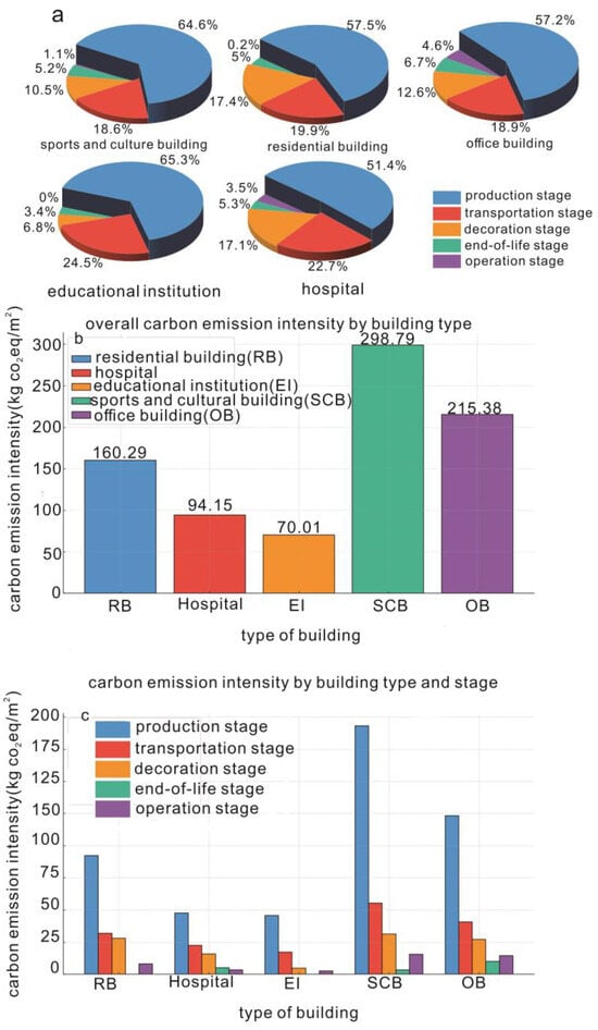 (a) Carbon emissions across building types; (b) carbon emissions intensity by building type; (c) carbon emission intensity by stage across building types.