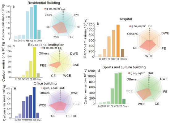 (a) Carbon emissions and carbon emissions intensity by subsections in a residential building; (b) carbon emissions and carbon emissions intensity by subsections in a hospital; (c) carbon emissions and carbon emissions intensity by subsections in an educational institution; (d) carbon emissions and carbon emissions intensity by subsections in a sports and culture building; (e) carbon emissions and carbon emissions intensity by subsections in an office building.