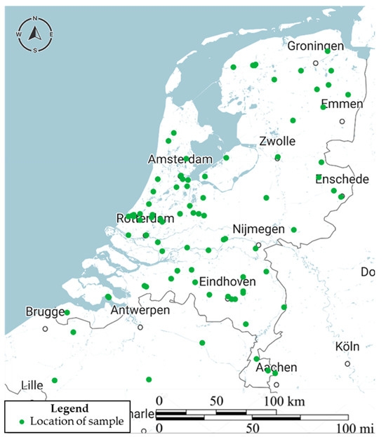A marketing company was engaged to recruit respondents from various cities, ensuring diverse representation from the tertiary sector. Given the focus on the purchasing intentions of small and medium-sized enterprises (SMEs) regarding energy facilities, the respondents were typically SME owners or individuals in managerial roles. Figure 2 shows the spatial distribution of the companies (several are located within Belgium). Additionally, we required respondents to have a recent investment intention, which led to the relatively low response rate of 15.6%, with 126 out of 810 contacted individuals providing valid data. While this response rate may seem modest, it reflects the challenges inherent in engaging this specific demographic. To enhance the sample size, we employed the stated choice method, where each respondent answered eight choice scenarios, each varying in context, resulting in a total of 1008 choice observations for analysis. This approach not only increases the robustness of the dataset but also strengthens the validity and reliability of the findings presented in this study.