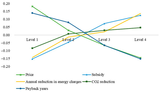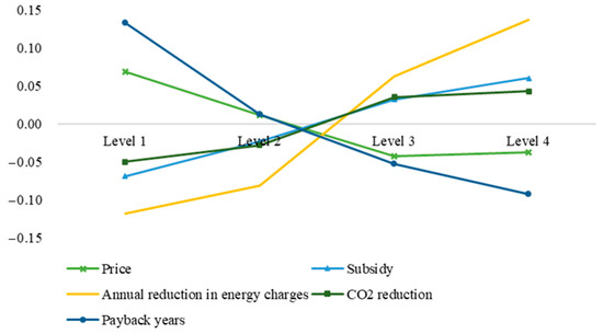 As reported in Table 5, most of the estimated parameters are statistically significant. The installation price of €2500 (0.181) has a significant and positive effect on the adoption of solar panels, while the adoption intention is negatively related to the installation price when the price is higher than €7500. This means the acceptance decreases with the increasing installation price. The difference between the effects of price at €2500 and €10,000 is 0.326. These results are broadly in line with the findings of existing studies [30].