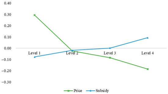 The estimated parameter for incentives set at 0 is −0.077, while the estimated parameter for 30% is 0.094. Government incentives are found to have a significant and positive effect on the intention to install ventilation. Similar to the effects on heat pumps, the probability of installing ventilation increases linearly when the incentive increases from 10% to 30%. The effect of the demand control function is negative, which means companies in general are reluctant to the advanced control features. In addition, positive impacts were found for the function of filtering out pollutants and heat recovery, which suggests the added functions can increase the probability of adopting ventilation. The filtering function has the largest effect among the three functions, which means people weigh the filtering function more than the other two. The values and changes in the estimated coefficients are presented in Figure 4. The two marginal effect lines in Figure 4 indicate that the marginal effects of price and tax incentives are not linear.