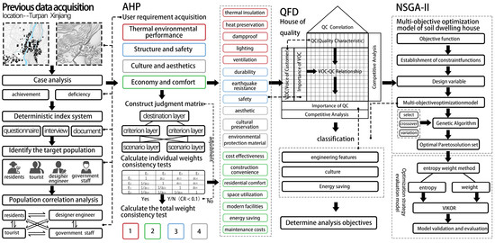 To address these challenges, this research introduces an innovative integration of the Quality Function Deployment (QFD) model, the Analytic Hierarchy Process (AHP), and the Non-Dominated Sorting Genetic Algorithm II (NSGA-II) to create a comprehensive, multi-objective framework for the renovation of traditional earth dwellings. This framework enhances the functionality of Tuyugou Village’s dwellings while providing a transferable model for similar projects, setting it apart from existing studies with key innovations, which are described here.