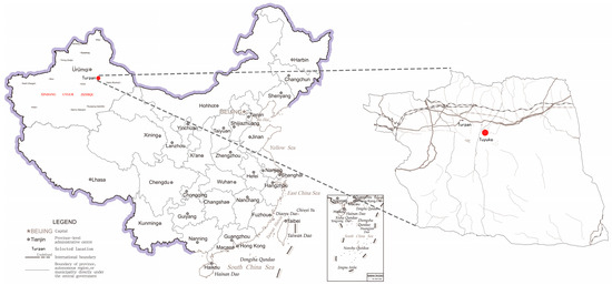 Tuyugou Village, situated in the Turpan region of Xinjiang (see Figure 4), is depicted in Figure 5. Extending from north to south, the village encompasses the Subashi Ruins, the Thousand Buddha Caves, and ancient tombs. In 2005, the village was designated as a national historical and cultural site, making it the first of its kind in Xinjiang [4]. The layout of the village maximizes the natural terrain, seamlessly integrating mountains, waterways, dwellings, and roads—a characteristic trait of oasis settlements [5]. Water from a branch of the Tianshan system irrigates surrounding fields via channels along the river, while buildings are harmoniously integrated with the surrounding hills and farmland. The primary water system creates a “川” (“The character ‘川’, which means ‘river’ in Chinese, is used here to illustrate that the layout of the three rivers resembles this character.”) -shaped configuration, merging natural and cultural features [4]. To conserve farmland, the village expands outward from its central structures, with houses positioned to optimize sunlight and protect against wind. The road network, intersecting with the water system, consists of primary roads, a central ring road, and smaller paths, all tailored to the terrain and designed to meet residents’ transportation needs [28,29].