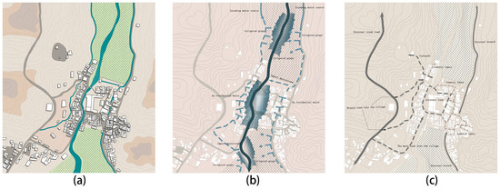 Layout of Tuyugou Village. (a–c) Building layout, water system layout, and road layout, respectively.