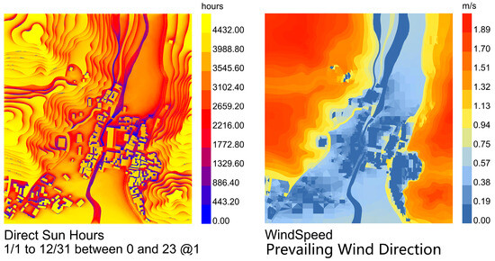 In line with the hot summer and cold winter climate that is typical of Xinjiang, the site selection for Tuyugou Village adheres to traditional Chinese principles, specifically “Avoid constructing high on ridges with limited water and avoid building low near water to reduce ditch construction effort” [4]. The village is situated between two mountains in the heart of a valley, which serves to shield it from cold winter monsoons and reduces direct solar exposure during the summer months. The majority of the buildings are oriented toward the water, capitalizing on evaporative cooling that reduces the temperature by approximately 2 °C while increasing humidity relative to the surrounding mountains. During the night, wind speeds toward the valley decrease, and in winter, temperatures within the valley are typically 2–3 °C warmer than those outside [30]. To evaluate Tuyugou Village’s ecological adaptability, we utilized Ladybug simulation software 1.5.0 on the Rhino and Grasshopper platforms to model annual sunshine hours and prevailing wind patterns. The results, presented in Figure 6, reveal that the village experiences reduced sunlight exposure and lower wind speeds compared to the surrounding mountains, showcasing its exceptional ecological adaptability to extreme environments.