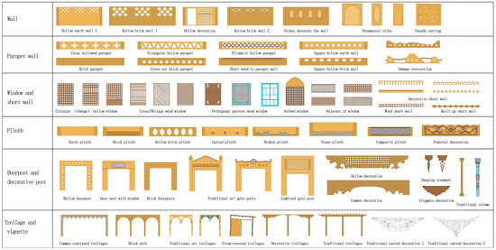 Traditional earthen dwellings are built from rammed yellow clay, featuring essential components such as boundary and courtyard walls, partition walls, short fences, gates, corridors, high sheds, storage rooms, hearths, grape-drying rooms, toilets, and livestock pens [39]. Decorative elements were added to the walls of these structures to enhance their artistic value. Unique geometric patterns were created by strategically placing bricks on door pillars and hollowing out sections of the short fences. Certain buildings highlighted their significance through the use of brick arches [39,40]. Intricately carved columns with distinctive shapes and vibrant colors enhanced the artistic appeal within the courtyards. Sheds were classified into inner courtyard sheds, external support sheds, roof sheds, built-in sheds, and corridor sheds. Windows, often adorned with hollow carvings, were available in square, arched, or strip shapes. These decorative techniques were employed to beautify the environment, enhance the architectural facade, and emphasize the building’s overall theme. As illustrated in Figure 8, the exterior elements are divided into five major categories and 69 individual components.