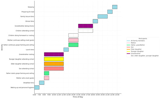 To reveal the daily activity schedule and room usage patterns of the local residents, the research team conducted questionnaire interviews with residents of Tuyugou Village. The results, as shown in Figure 9, illustrate the daily routines and activities of an extended family, highlighting traditional roles, shared family times, and the energy consumption needs necessary for their daily lives. These data are instrumental in understanding how housing design can be adapted to optimize energy use according to the specific activities of various family members throughout the day.