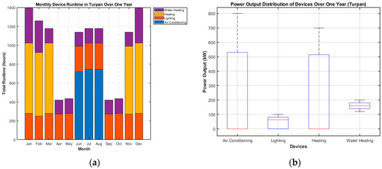 Based on the above information, the equipment operation time for the local traditional soil dwellings is shown in Figure 10a, and the power output distribution is shown in Figure 10b. This indicates that, due to Turpan’s extreme climate conditions, the power consumption of air conditioning and heating fluctuates significantly. Their usage frequency is concentrated during specific climate conditions, while the power consumption of lighting and water heaters remains relatively stable. However, there are some fluctuations as the seasonal climate changes.