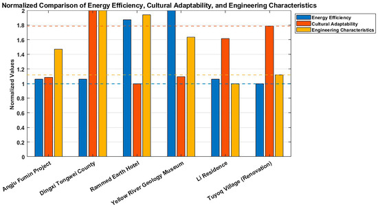 To assess the design’s industry competitiveness, the project team integrated competitive analysis modules into the right and bottom sections of the House of Quality. These modules enabled a comprehensive evaluation of the strengths and weaknesses of each project, emphasizing specific design attributes. Five prominent earthen architecture projects in China were selected, representing key industry trends. The selected projects were the “Anju Fumin” demonstration [1], the Tongwei County residence renovation (Dingxi) [34], the Urho earthen hotel in Karamay [35], the Yellow River Loess Geological Museum [36], and the Li family earthen house renovation [37]. A symbolic scoring matrix evaluated each project’s design indicators. The resulting scores offered insights into each project’s performance across different design attributes and their alignment with client expectations [38]. Through the analysis of these results, the team developed a House of Quality model, facilitating a detailed comparison of each design’s competitive positioning, as illustrated in Figure 7.