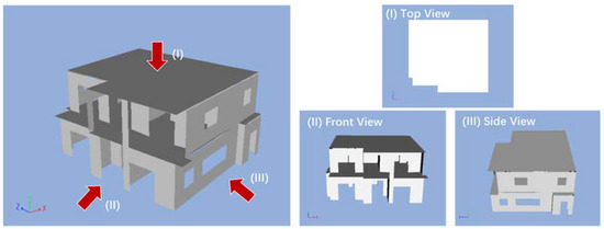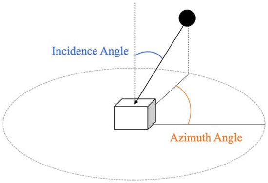The radar sensor was simulated using an orthographic camera model positioned above the building. The incidence angle was set at various angles to fully capture the target building’s appearance. To ensure the radar beam accurately targeted the building’s center, the sensor was oriented to face the building’s central point. The field of view’s width and height were adjusted to encompass the entire building target, enabling comprehensive capture of its reflective properties. A parallel light source representing the radar antenna was aligned with the sensor and directed toward the building center, with a pure white signal emission to maintain uniform signal intensity.