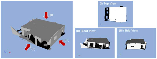 Figure 2 illustrates a two-story wooden structure in three dimensions, representing the buildings employed in this study. The numerical model employed for the analysis of the reflective characteristics of the building model was developed using Wallstat software by the Building Research Institute of Japan. Wallstat is a computer program that employs the discrete element method theory to analyze the collapse behavior of wooden structures subjected to seismic motion [27]. The Wallstat simulation requires input of the building’s floor plan, elevation plan, structural information (such as columns, beams, and walls), and the building’s weight.