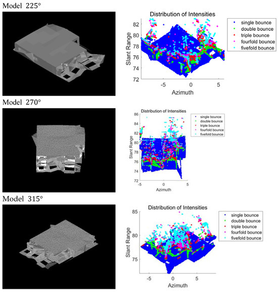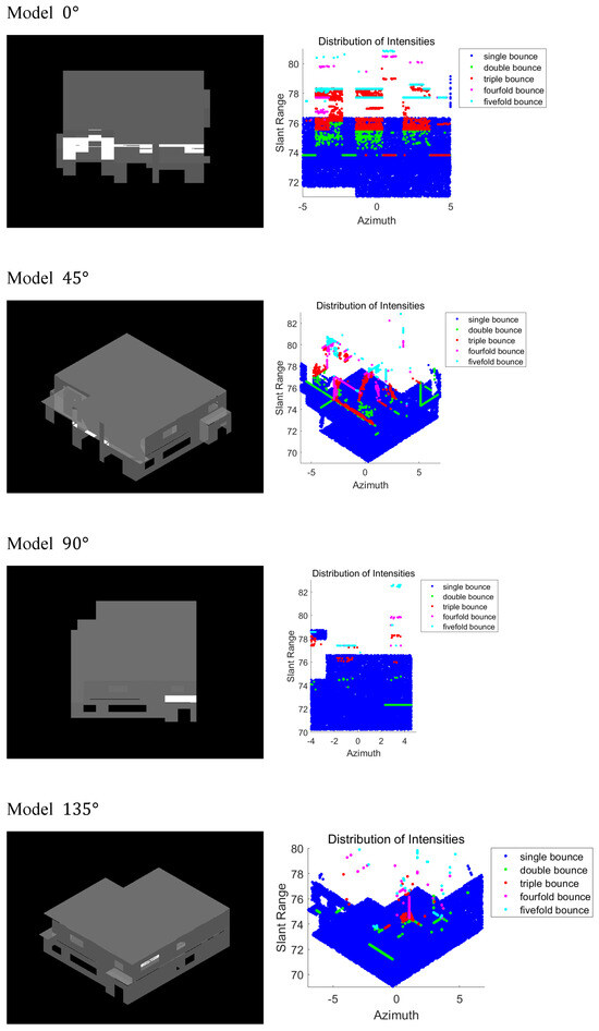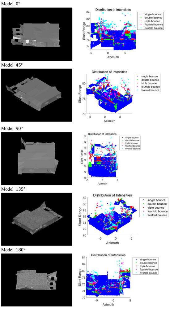 Figure 7 depicts the uncollapsed building model and the corresponding intensity spatial distribution at incidence angle 40. The different colors used to indicate the detected scatterer categories are as follows: blue represents a single bounce, green denotes a double bounce, red indicates a triple bounce, magenta signifies a fourfold bounce, cyan corresponds to a fivefold bounce, and white is used for cases where no signal response is evident. Figure 8 depicts the outcomes of the simulated intensity spatial distribution proportions for varying incidence and azimuth angles.