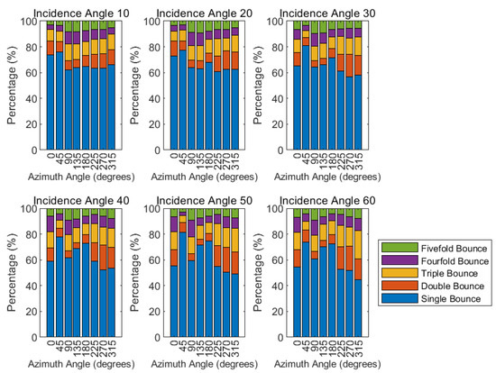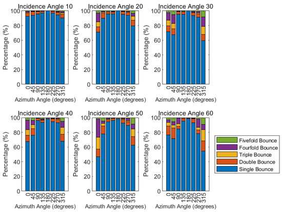 From Figure 5 and Figure 6, the primary form of scattering in the collapsed building is single bounce, shown in blue. As the incidence angle increases, the occurrence of multiple reflections does not increase as significantly as in the uncollapsed building model but does show a slight upward trend. For example, at incidence angles between 40° and 60°, compared to angles between 10° and 30°, the proportion of single-bounce reflections decreases to 50% at azimuth angles of 270° and 315°. This suggests that the building’s surface geometry and material properties are not significantly affected by changes in the incidence angle in terms of scattering mechanisms.
