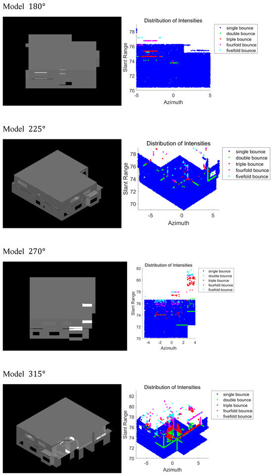 On the right side of the building (see Figure 7 at 315°), double-reflection lines are discernible at the intersection of the first and second floors, indicated in green. This phenomenon may be attributed to the step-like dihedral shape, which causes double reflections. In areas exhibiting a greater degree of planar structure, a multitude of single reflections are evident, depicted in blue. In the areas of the window and door, regular double and triple reflections are observed. At a rotation angle of 180° (incidence angles of 10°–30°), the intensity spatial distribution exhibits a singular outcome, namely, single reflections, as indicated by the blue hue (see Figure 8 incidence angles of 10°–30°at 180°). This is due to the fact that, from this angle, only flat structures are visible, which prevents the occurrence of double reflections. In theory, scattering typically involves a single bounce (flat plate), a double bounce (dihedral), a triple bounce (trihedral), edge diffraction (cylinder and domed cap), a cavity (hollow cylinder), and shadowing (obstacles between target components). It can be concluded that the simulation results are in accordance with the theoretical predictions.