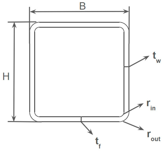 In this study, the novel cross-sections examined by Marinopoulou et al. [38] were utilised with slight adjustments. Square hollow sections (SHSs) featuring both inner and outer fillets have been included, as they offer better manufacturability compared to profiles without radii or with radii only on the inner or outer edges. The incorporation of corner radii enhances the effectiveness of extrusion manufacturing processes. Imperfection parameters are sourced from Georgantzia et al. [39], and the various types of cross-sections are illustrated in Figure 1 and Figure 2. Detailed cross-sectional dimensions are provided in Table 1.