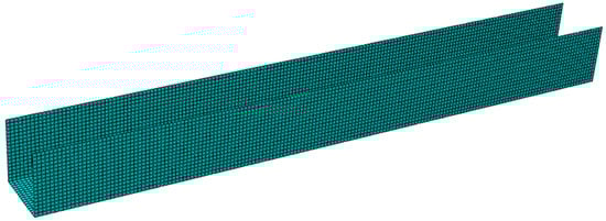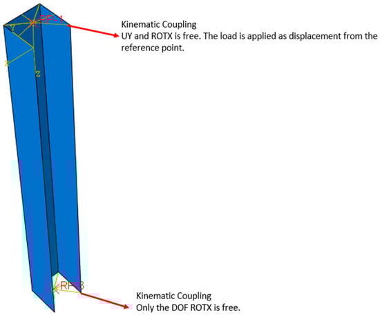 The aluminium C-section column is represented using shell elements, depicted in Figure 3. Utilising shell elements is a widely adopted practice for thin-walled columns, as demonstrated in the literature [8,10,12,39]. S4R element from the ABAQUS element library was employed. To simulate the pin-ended column test accurately, one of the rotational degrees of freedom is left unconstrained. This is achieved using KINEMATIC COUPLING constraints via the RBE2 element, as illustrated in Figure 4, since both ends of the column are pin-ended. Specifically, the UX and ROTY degrees of freedom (DOFs) are set free based on the column’s orientation during the column test.