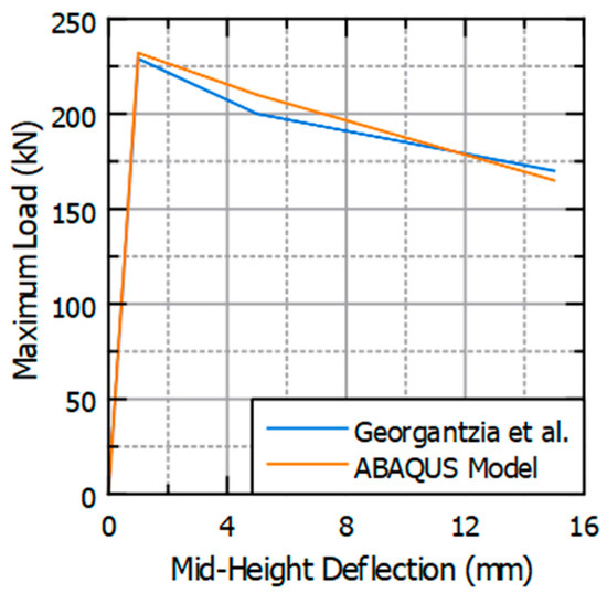 The comparison between the maximum load and mid-height deflection results of the first validation study is depicted in Figure 5, showing an exceptional alignment between the outcomes. Specifically, Table 2 provides a detailed comparison of the ultimate load between the findings of [39] and those derived from the present investigation.