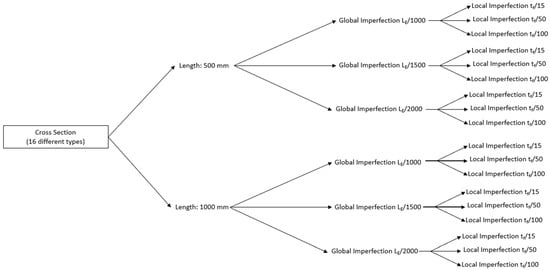 Table 4 and Figure 8 present the comprehensive conditions encompassing cross-section types, imperfection specifications, and column lengths considered in this study. Each cross-section variant is tested across both column lengths. Also, for each length, three of the global imperfections have been applied to columns. For each global imperfection value, three of the local imperfections have been combined for the study. Subsequently, all specified local imperfection values are individually applied to each setup. Global imperfection values are determined based on the effective length of the column, while local imperfection values are calculated using the flange thickness.