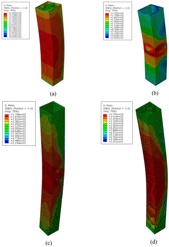 Some examples of buckling results of various columns with equivalent stress contours (MPa) (a) N2-0.5 m, (b) B1-0.5 m, (c) N4-1 m, (d) A4-1 m.