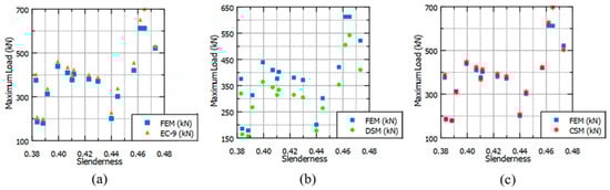 Methods comparison with respect to FEM results of 0.5 m columns (a): FEM vs. EC-9, (b): FEM vs. DSM, (c): FEM vs. CSM.