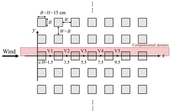 Figure 2 illustrates the calculation domain with model details, including half of the center model column and half of the adjacent passage. Consequently, the lateral boundaries were designated as symmetry boundaries. As the original experimental model has a wide-spanned, axis-symmetrical layout (Figure 1), the flow conditions within the middle part are away from disturbances at the lateral fringes of the model cluster, which has been validated by previous numerical studies employing similar calculation domains [,,,,,,]. In addition, the top boundary of the calculation domain was also set as a symmetry boundary. The domain outlet was specified as outflow with zero normal gradient. A zero normal flux condition was set for all solid non-slip walls, including the floor. The size of the calculation domain was defined according to the AIJ CFD guideline for urban modeling [].