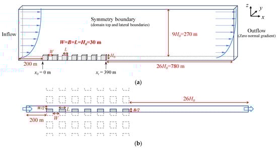 Geometries of scaled-up calculation domain and models for validation cases. (a) 3D sketch of the calculation domain, with boundary conditions specified. (b) Top view of the calculation domain. Notations: B = model width, L = model length, W = model spacing, H0 = model height in the reference value as 30 m, x0 and xt are x coordinates of the starting and ending positions of the built area. Arrows indicate the direction of flow.