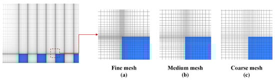 Three near-wall mesh arrangements for the mesh-independence test, with varying minimum grid spacing near the model edges, denoted as (a) fine mesh, (b) medium mesh, and (c) coarse mesh separately. Model locations are indicated in blue.