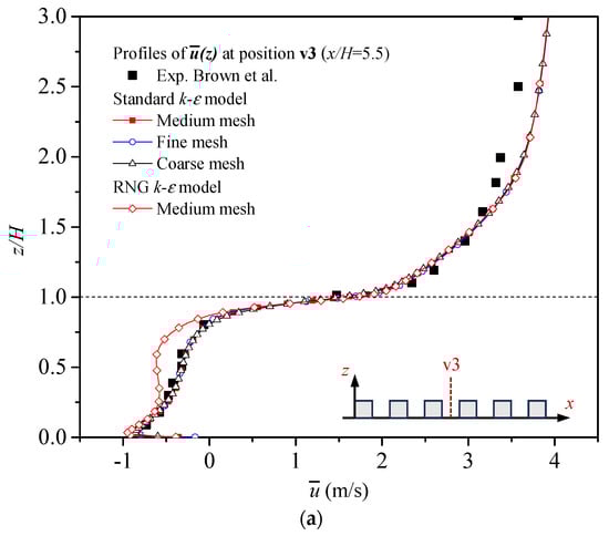 In Equations (7)–(9), U0 is the reference velocity magnitude of the approaching free flow at model height (z = H), which is 3 m/s in the wind tunnel experiments by Brown et al. []; , the friction velocity, was assessed to be 0.24 m/s in the experiment [,]; is a model constant, which equals 0.09; and is the von Karman’s constant and equals 0.41 [].