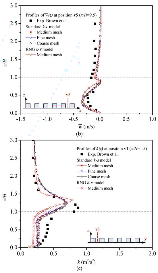Vertical profiles in validation cases compared with wind tunnel measurements in []: (a) at sampling position V3, (b) at position V5, and (c) k(z) at position V1.