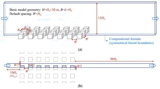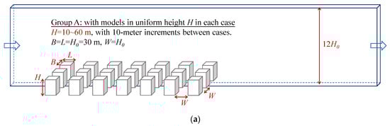 Based on the idealized urban model validated above, various modifications on the model geometries were implemented to study the influences of interested morphology characteristics on the urban ventilation capacity. The model layout in the validation case was adopted as the base case, while the computational domain is expanded following guidelines [,] to accommodate various adaptations on models for parametric studies, as illustrated in Figure 5. The model height of 30 m in the validation case is taken as the reference building height, denoted as H0.