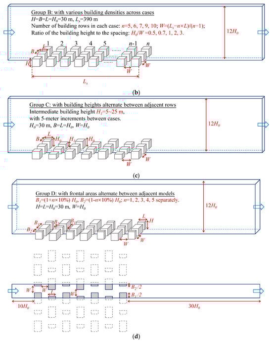Four generic parameters describing urban morphologies—building height, building density, and variations in the heights or frontal areas of adjacent buildings—were studied by four groups of simulation cases. The model geometry and arrangement in each case were modified according to the focused factor, as illustrated in Figure 6. Group A investigated the influence of building heights, with uniform model heights ranging from 10 m to 60 m across cases (Figure 6a). Group B maintained the building height as 30 m, while varying the spacings between buildings to achieve the desired building densities in each case. The cases in group C feature height variations between adjacent building rows, with the 2nd, 4th, and 6th rows at a distinct height H1 rather than H0, which ranges from 5 to 25 m, increasing by 5 m between cases. In group D, the widths B of adjacent buildings vary while maintaining a constant sum of frontal areas of any two adjacent models as 2 × B × H0 m2. The alteration in width B varies from 10% to 50% of H0, with a consistent increment of 10% across the cases. In addition, the calculation domain for group D was extended in the spanwise direction to ensure geometrical symmetry across the lateral boundaries, as illustrated in the top view in Figure 6d.