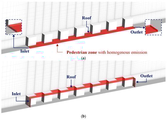 CFD simulations have been widely applied in the modeling of flow and thermal conditions within the UCL in past decades [,]. Among popular numerical methods, the Large Eddy Simulation (LES) has been known to perform better in predicting turbulence than Reynolds-Averaged Navier–Stokes (RANS) approaches. Nevertheless, challenges still persist in the widespread application of the LES, typically including the high requirement of computational resources and difficulties in specifying appropriate time-dependent boundary conditions [,,,]. Despite their deficiencies in predicting detailed turbulence features, steady RANS models have become the most popular CFD approaches for modeling urban flows, and the standard k-ε model is one of the most widely adopted two-equation turbulence model [,,]. Since transient features were not the focus in this study, the standard k-ε model was adopted for the simulations due to its adequate accuracy, which has been validated by experimental measurements, and its reliability in predicting time-averaged features. Additionally, as parametric studies require an adequate set of cases to quantitatively evaluate the impact of a specific factor, it is more practical to adopt RANS approaches considering the overall computational costs.