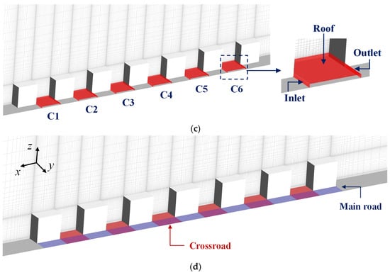 Different partitions are specified as shown in Figure 7. The pedestrian zone, highlighted in red in Figure 7a, is defined as the region from z = 0 m to 2 m, covering the entire built area from the first to the last building row (i.e., 0 ≤ x ≤ Ls, 0 ≤ y ≤ Wdomain, and 0 ≤ z ≤ 2 m). The canopy zone is defined between the roof level of the highest building in the calculation domain and the ground (Figure 7b). Both the pedestrian zone and the canopy zone have an inlet interface at the upstream entrance, and an outlet at the downstream exit of the built area between their respective roof and ground levels. Furthermore, the spaces between the building rows within the pedestrian zone are designated as Crossroads (Figure 7c), labeled as Cn, where n denotes behind which building row the crossroad is located. Accordingly, the street parallel to the incoming wind is named as the Main Road (Figure 7d). In addition, the breathing level is specified at z = 1.7 m across the built area, where flow conditions and distributions of will be stressed.