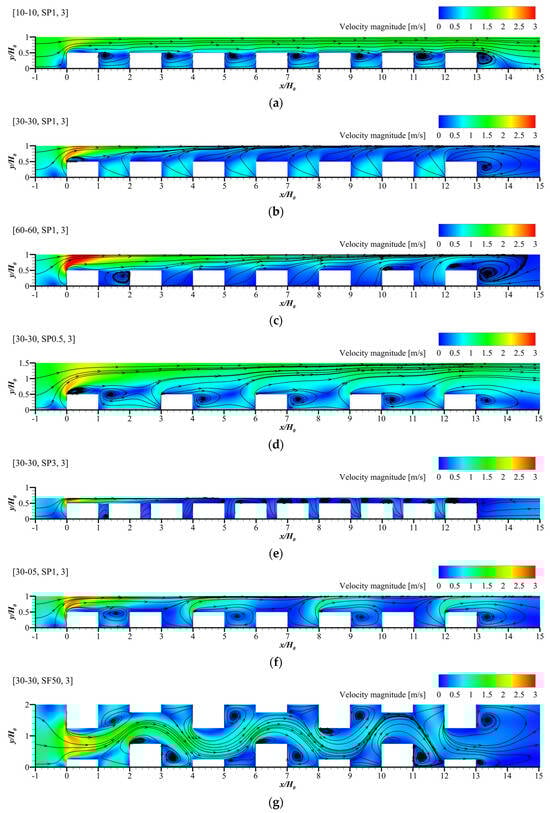 The spacing between buildings dramatically affects the flow rate penetrating into the UCL, as indicated by the contrasting velocity magnitudes shown in Figure 8d for case [30-30, SP0.5] and Figure 8e for case [30-30, SP3]. Figure 9e denotes a lifting trend of the flow along the main road with extremely heigh building density (SP3), which enables the formation of recirculation zones near the lateral facades by the outflows from the downwash behind buildings, corresponding to the small vortices shown in Figure 8e.