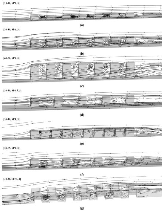 For the cases in group D, with the same total frontal area for each row, the alternating frontal areas of the two buildings on the left and right side bend the inflow into a curved shape throughout the built area (Figure 8g), with the curvature proportional to the difference between the frontal areas. Notably, as case [30-30, SF50] shows in Figure 8g, significant recirculating flows appear behind the wider buildings due to their considerable blockage in the streamwise direction.