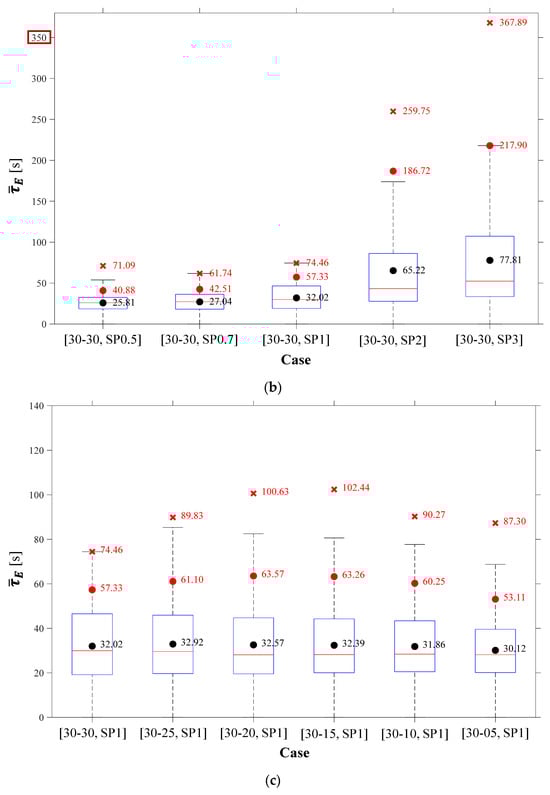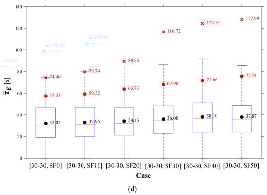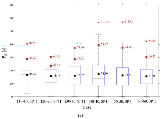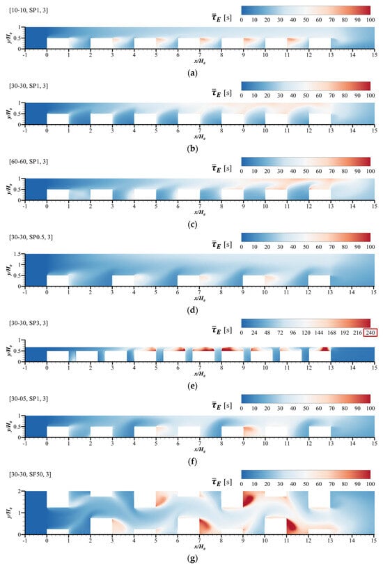 The average values of the entire breathing level section for the cases in groups A, C, and D are close, ranging from 30 s to 40 s (Figure 11a,c,d), while the values corresponding to the 95th percentile and the maximum vary significantly across cases. In group A (Figure 11a), cases [40-40, SP1] and [50-50, SP1] exhibit higher maximums and averages, rather than the case with the tallest buildings. This fact is attributed to the combined effect of a relatively weaker streamwise main road flow and moderate convergence from the crossroad flows, as discussed in Section 3.1. Additionally, the box plot for case [10-10, SP1] implies distinct outliers, aligning with the presence of high- centers within the recirculation zones behind buildings (Figure 8a and Figure 10a), which diminish when the building height increases to 20 m. Meanwhile, for group B, as shown in Figure 11b, the increasing building density significantly raises both the average value and the proportion of outliers, quantitatively depicting the emergence of larger areas with a high when W < H0 (i.e., SP > 1). In group C, the intermediate building obstructs the mixing between the two crossroads as its height increases. Meanwhile, the flow intensity along the main road becomes weaker when the average building height increases, which benefits the purging of the crossroads by the outward flow. Both mechanisms concurrently modify mass transport. Consequently, cases [30-20, SP1] and [30-15, SP1] suffer both the accumulation within the recirculation behind the tall buildings and deteriorated mixing between crossroads, which corresponds to elevated maximum values in Figure 11c. Nevertheless, in group D, the increasing difference in the frontal area of the two adjacent buildings consistently deteriorates ventilation conditions at the breathing level, attributing to the enhanced recirculation zones behind wider buildings (Figure 8g and Figure 10g), leading to severe pollutant accumulation and extreme outliers, as shown in Figure 11d.