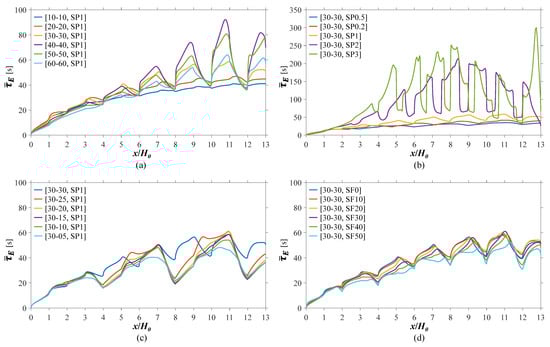 The spanwise (y direction) integrations of along the main road are presented in Figure 12. Across all cases, the dips shown in the line charts mostly contributed to the outward crossroad flows, attributed to the downwash close to the windward facade. There are also several noteworthy results within each group. Figure 12a shows more accumulation in the downstream part of the main road for cases [40-40, SP1] and [50-50, SP1], which is consistent with the result shown in Figure 11a. With high building densities, the small recirculation zones have extremely high values, attached to the lateral facades facing the main road in cases [30-30, SP2] and [30-30, SP3], leading to the surge in , as shown in Figure 12b. Additionally, the peak value at the end of the road in case [30-30, SP3] stems from the backward flow branch of the vortex after the whole building row, which can be found in Figure 9e. Notably, with variation in either building heights or the frontal area, the ventilation conditions on the main road are improved compared to the base case (Figure 12c,d), as the high-value centers are located at the crossroads behind the buildings, according to the contour plots in Figure 10f,g.