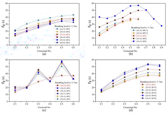 The average at breathing level for each crossroad, categorized by groups. Subfigures (a–d) are arranged in the order corresponding to case groups A to D.