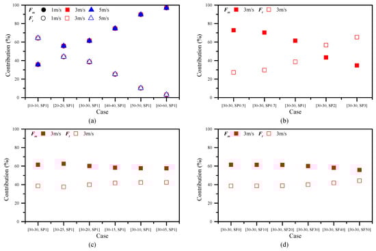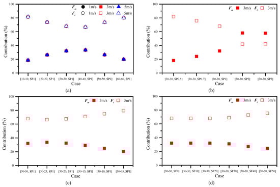 Figure 15 presents the contribution fractions of convective and turbulent transport for the pedestrian zone, followed by Table 6 summarizing the ratios of Fm/Ft for both canopy and pedestrian zones across all cases. In group A (Figure 15a), the turbulent transport consistently dominates, while the fractions of both Fm and Ft show a U-shaped trend with increasing building height. As discussed in Section 3.2.1, cases [40-40, SP1] and [50-50, SP1] feature the highest maximum and a large portion of extremes of values among all cases in group A at the pedestrian level. This fact indicates a higher overall concentration within the pedestrian zone for these two cases, which relatively enhances convective transport, according to the definition of Fm by Equation (4). In group B (Figure 15b), the relative magnitudes of Fm and Ft in relation to the building density present an inverse relationship compared to that for the canopy zone shown in Figure 14b. As illustrated by the 3D streamlines in Figure 9e for case [30-30, SP3], with narrow spacings, the streamwise flow ascends along the main road, accompanied by active upward flows from the near-ground level. In addition, a higher building density, with more buildings in the built area, leads to an increase in helical flows within the building intervals. Both facts contribute to stronger vertical flows and significantly promote convective transport through the pedestrian roof for cases [30-30, SP2] and [30-30, SP3] (Table 6). In groups C and D (Figure 15c,d), the variations in the geometry of adjacent buildings both slightly amplified the turbulent transport for the pedestrian zone, which is similar to the results of the canopy zone (Figure 14c,d).